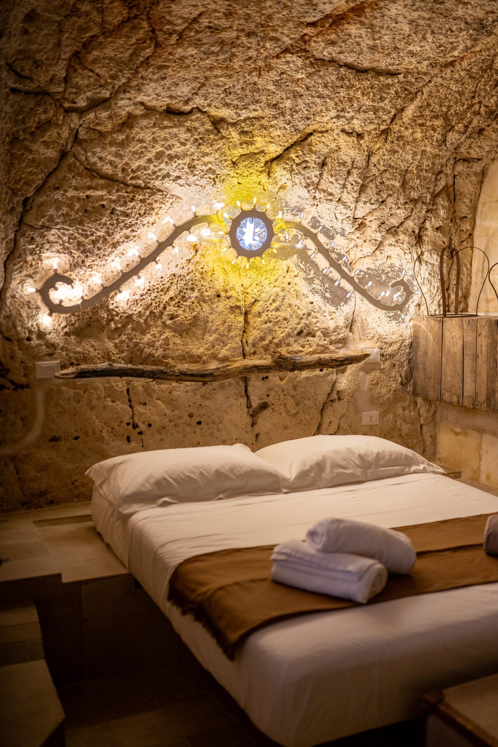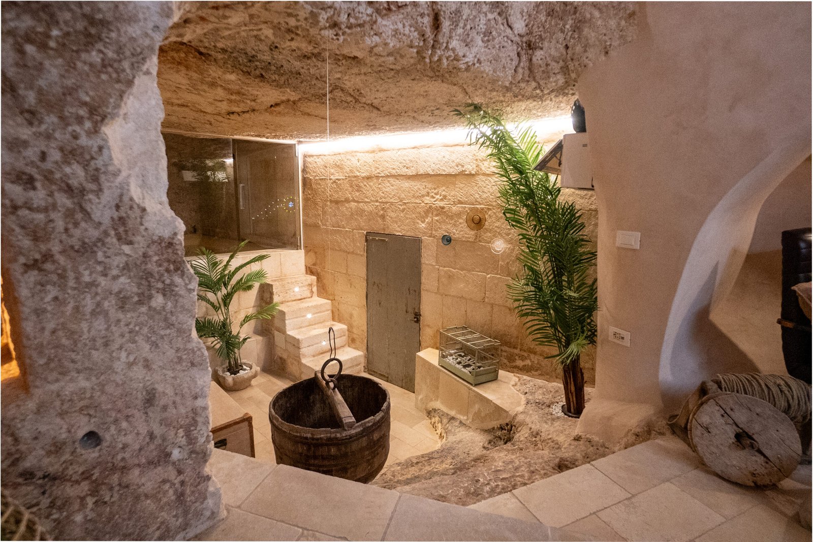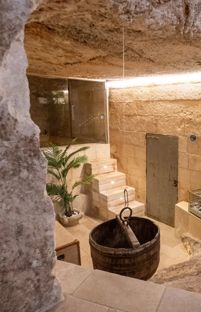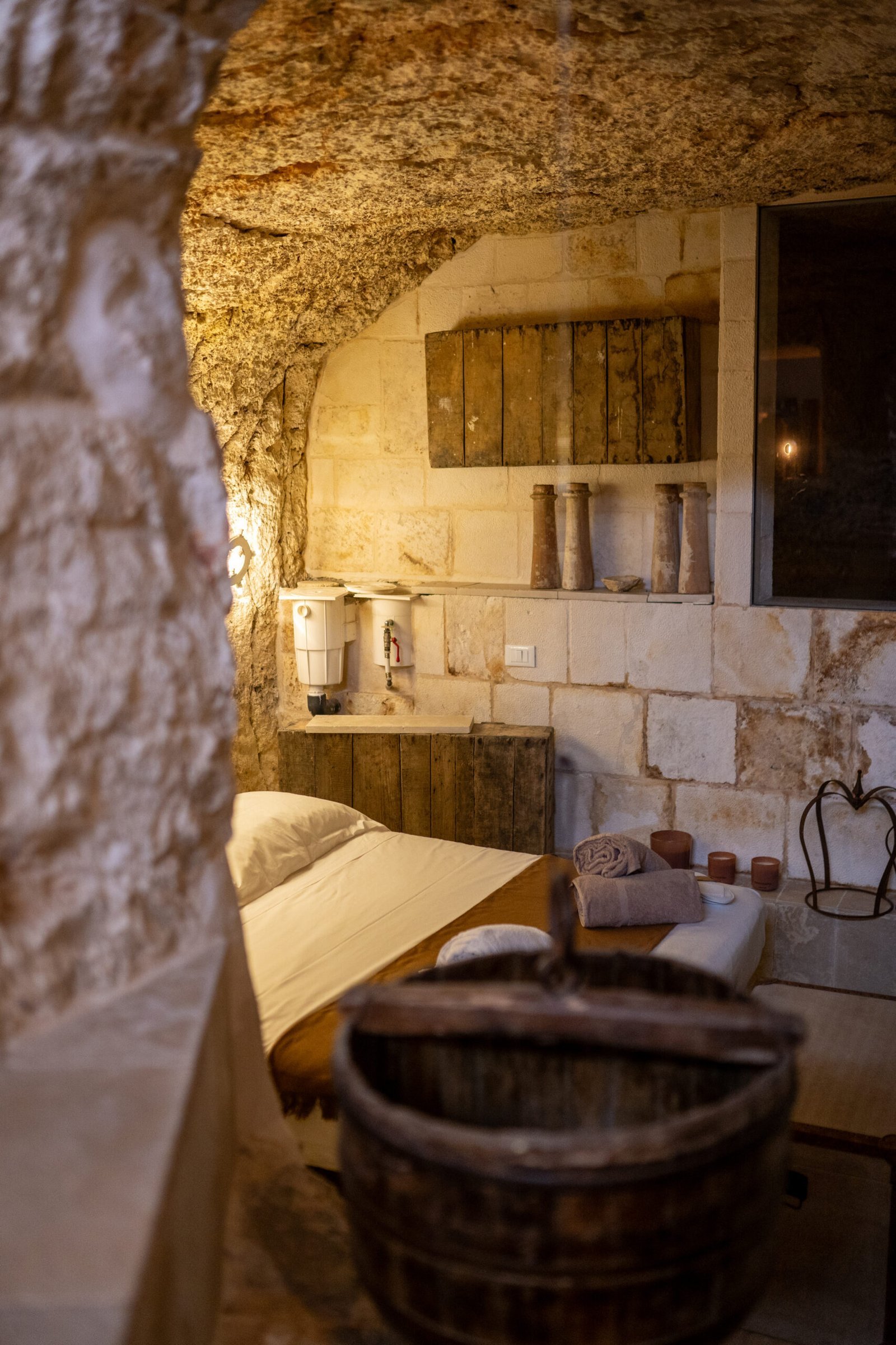 Cave Luxury Suite è uno spazio privato ricavato nella pietra, dove materiali naturali, linee morbide e luci calde creano un’atmosfera avvolgente.
