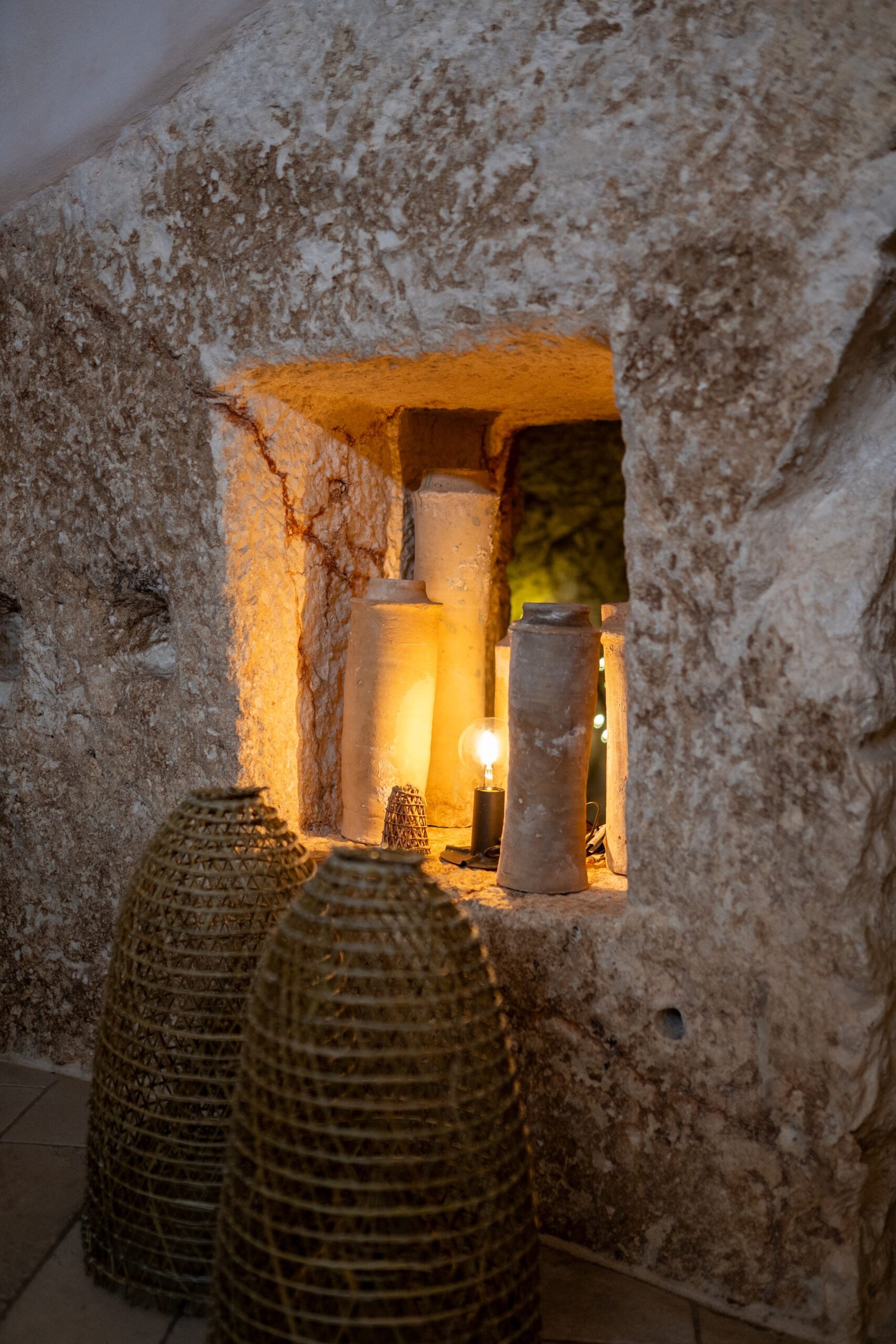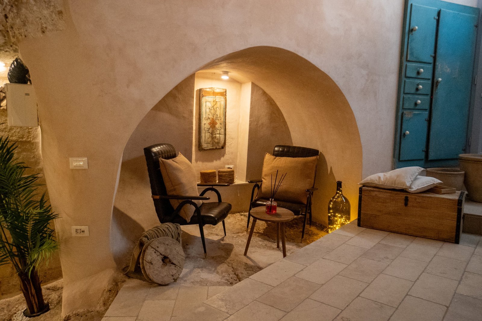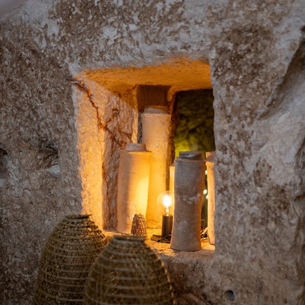 Cave Luxury Suite è uno spazio privato ricavato nella pietra, dove materiali naturali, linee morbide e luci calde creano un’atmosfera avvolgente.